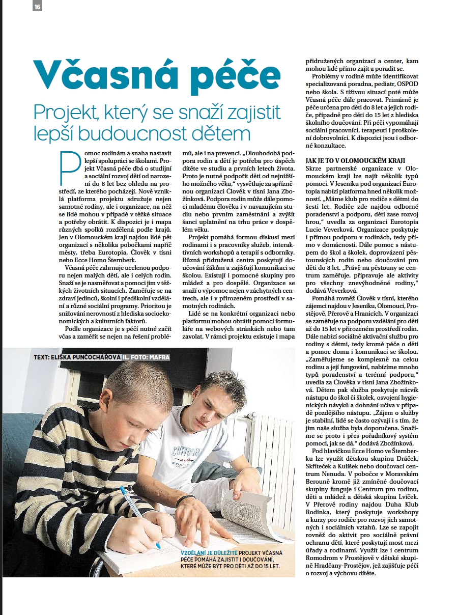 Článek v Mladé Frontě DNES pro Olomoucký kraj o včasné péči a práci členských organizací Ecce Homo, Člověk v tísni a Eurotopia.
